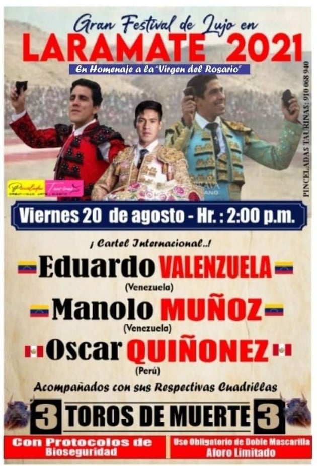 En homenaje a la Virgen del Rosario se ha programado para este viernes 20 de agosto una tarde taurina mixta en la plaza de toros del distrito de Laramate, en Lucanas (Ayacucho).