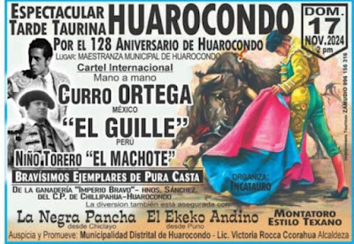 Con motivo del 128 aniversario del distrito mañana domingo 17 de noviembre se realizará una tarde taurina mixta en la plaza de toros del distrito de Huarocondo, en Anta (Cusco).